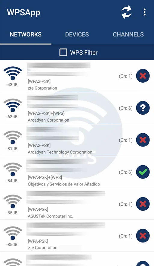 - صفحة الشبكات (Networks) : تُعد صفحة الشبكات القسم الأهم داخل الواجهة الرئيسية بعد تحميل برنامج WPSApp مهكر مجانا، حيث تقوم بعرض جميع شبكات الواي فاي المتاحة ضمن نطاق الهاتف في الوقت الحالي. تظهر كل شبكة مع مستوى قوة الإشارة الخاصة بها بالإضافة إلى تقييم مستوى الأمان المرتبط ببروتوكول WPS. يمكن للمستخدم تمرير الصفحة إلى الأسفل لإعادة تحديث القائمة والبحث عن شبكات جديدة. يتيح هذا العرض الشامل فهم البيئة اللاسلكية المحيطة بشكل أفضل، ويساعد في اختيار الشبكة الأقوى أو الأكثر أماناً بناءً على البيانات الظاهرة أمام المستخدم.